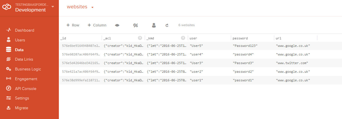 | >curl -H ‘Content-Type: application/json‘ --user APPKEY:MASTERSECRET -X PUT -d ‘{"user":"user","password":"password","url","www.google.co.uk"}‘ https://baas.kinvey.com/appdata/APPKEY/Websites | |