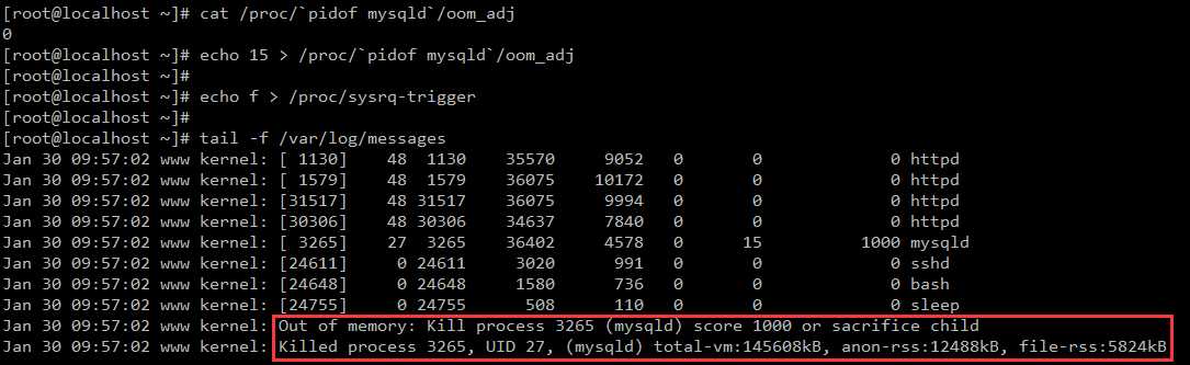 执行以上命令前后,明显会对比出效果,就可以体会到内核OOM机制的实际作用了。