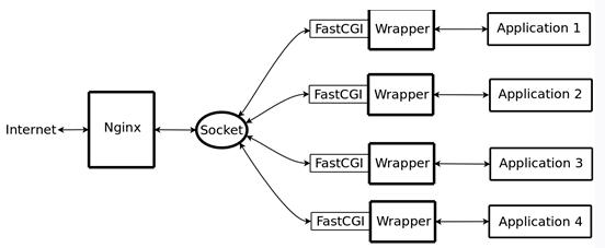 wrapper绑定在某个固定socket上,如端口或者文件socket。当Nginx将CGI请求发送给这个socket的时候,通过FastCGI