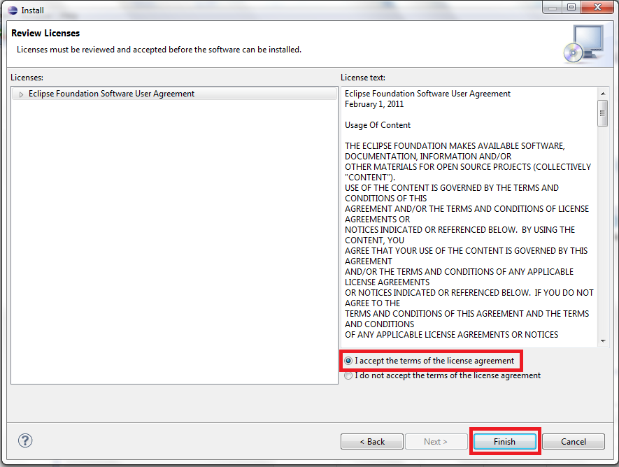 依次点击“Next ”知道你看到 “ Review licences”的窗口。在这个窗口选择 "I accept the terms of the licence agreement" 并且点击“Finish”。
