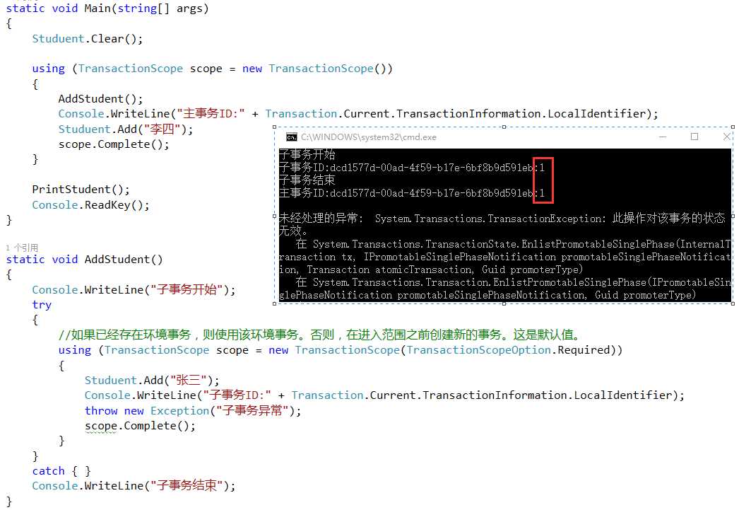 最初我以为在执行Complete后即刻提交,但根据输出结果可以看出,Complete方法执行两秒之后事务依旧没有提交。因为不允许脏读的原因,主线程会在事务对Student表操作完成后才可查询完成,但学生列表是在scope调用dispose方法之后输出,MSDN介绍说dispose确定事务范围末尾,因此猜测事务是在调用dispose时被提交。