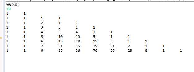 从键盘上输入一个正整数n,请按照以下五行杨辉三角形的显示方式, 输出杨辉三角形的前n行。