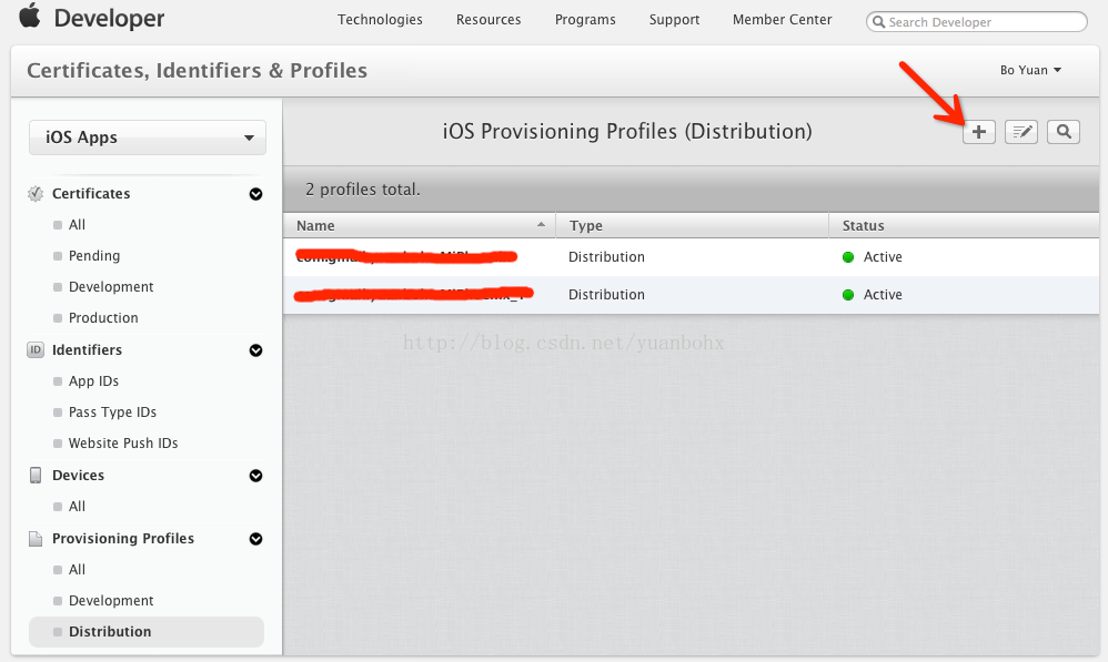 添加发布证书。点击左侧导航栏 Provisioning Profiles 中的 Distribution,添加一个新的证书: