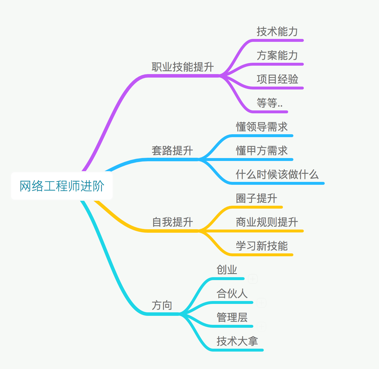对于每个阶段的人员都有自己对未来发展的期望,也许你现在觉的在山顶,也对对于未来的自己来说,现在其实你在山脚下。要懂得圈子的力量,不要试图改变周围的人,而是需要找机会跳入一个更高的圈子,圈子能给你的不止是金钱上的提升,而且会提高你的思维模式。职业技能往往变成次要,很多10年的IE都发展为公司的管理层和副总,这时候更多要求的是提升自己。