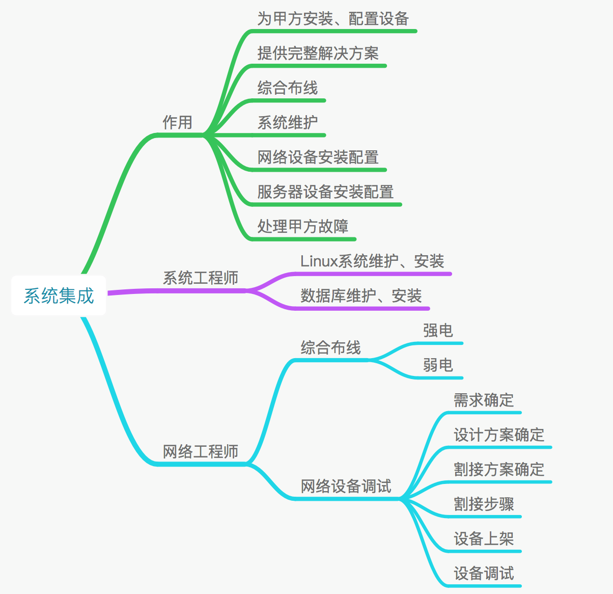所以在系统集成公司工程师分为系统和网络方向,系统集成-系统工程师负责系统(Linux)和软件相关工作。系统集成-网络方向,负责网络设备和网络安全相关工作。