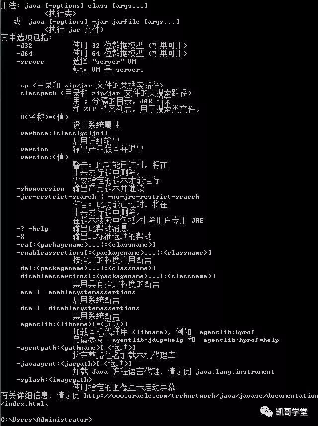 按开始菜单+R==》输入“cmd”回车,进入dos再输入java,显示如下,证明java开发工具安装成功