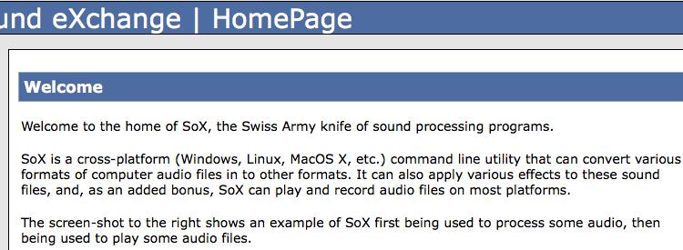 Sox(Sound eXchange)是操作声音文件的瑞士军刀,它可以播放、转换音频文件,添加效果。