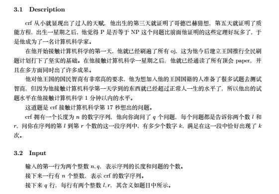 考完试后发现好多人拿莫队打了70分,才反应过来这道题可以拿莫队打,然而之前只是听Q某犇讲过莫队的原理,具体实现也没打过,于是乎在自己的WW下打了一个J队……不得不说还挺像的……额挺像的……,然而我在宿舍里都排倒数,人家莫涛是国家队队长,差距啊……