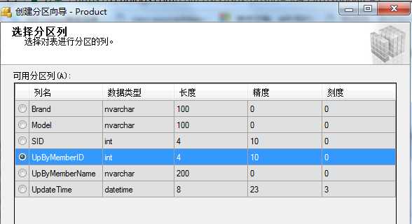 右击要分区的表-->存储-->创建分区-->选择分区列(这里UpByMemberID)-->选择分区函数