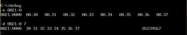 前提:用E命令将内存单元0021:0~0021:7连续8个字节数据修改为30H,31H,32H,33H,34H,35H,36H,37H.