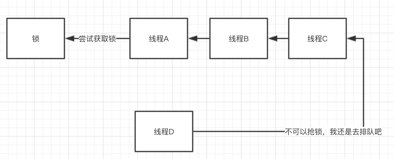 在线程A尝试获取锁,线程B、C还在A后面排队等待时,线程D可以来插上一杠子,去跟线程A争抢锁。