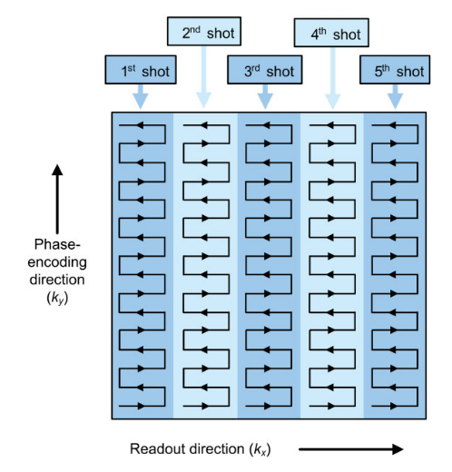 Readout-segmented EPI通过在readout方向分多次采集,可以有效避免这类问题。k空间填充方式如下图所示: