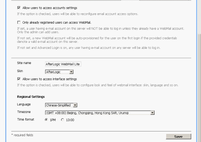 打開流覽器 輸入http://localhost/webmail/adminpanel,輸入用戶:mailadm和密碼 進入後點擊Domains——Default domain settins 設置如下:讓所有人都可以使用常規設置,語言選中文簡體,時區為+8保存窗體頂端