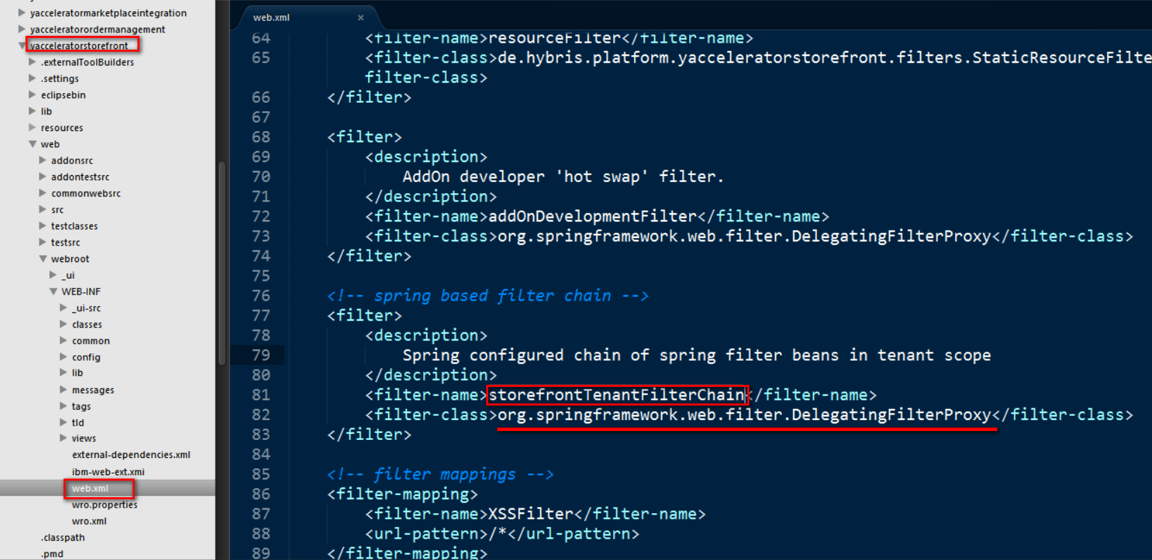 上面debug screenshot里诸多的filter是如何串成一个chain的?在storefront的web.xml里查找到filter chain的名称:storefrontTenantFilterChain