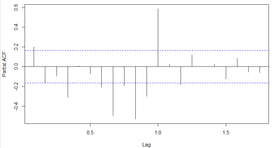 The blue line above shows significantly different values than zero. Clearly, the graph above has a cut off on PACF curve after 2nd lag which means this is mostly an AR(2) process.