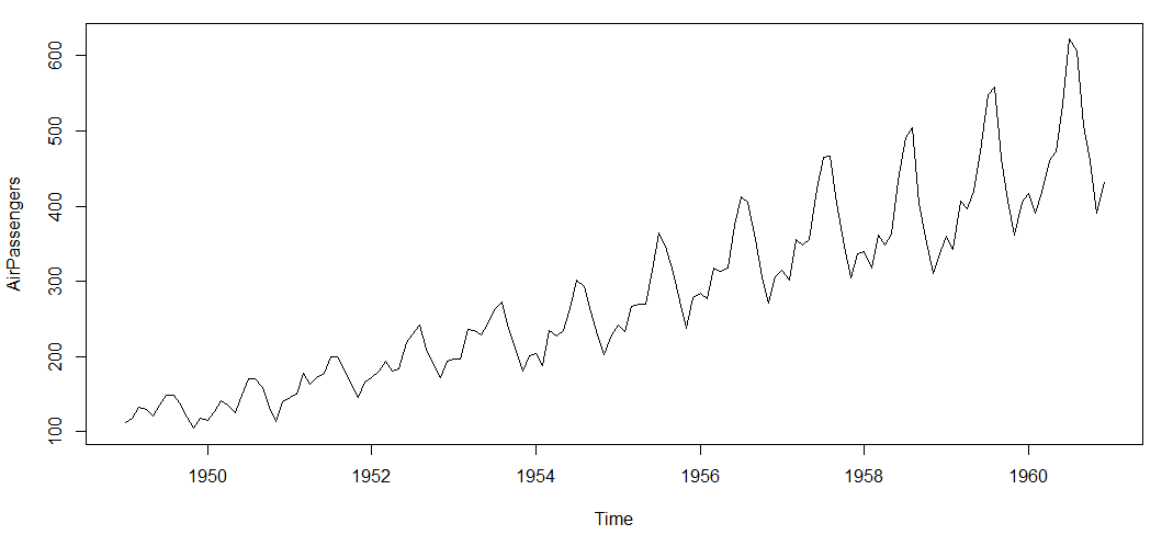 I have used an inbuilt data set of R called AirPassengers. The dataset consists of monthly totals of international airline passengers, 1949 to 1960.