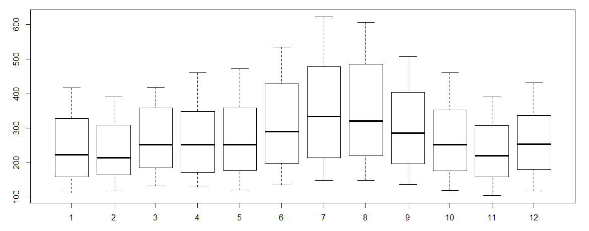 > cycle(AirPassengers) #This will print the cycle across years. >plot(aggregate(AirPassengers,FUN=mean)) #This will aggregate the cycles and display a year on year trend > boxplot(AirPassengers~cycle(AirPassengers)) #Box plot across months will give us a sense on seasonal effect