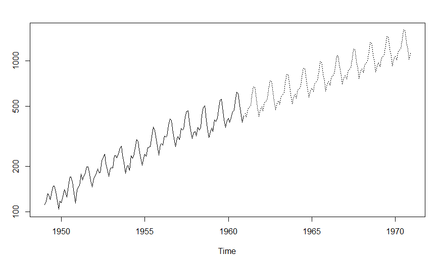 (fit <- arima(log(AirPassengers), c(0, 1, 1),seasonal = list(order = c(0, 1, 1), period = 12))) pred <- predict(fit, n.ahead = 10*12) ts.plot(AirPassengers,2.718^pred$pred, log = "y", lty = c(1,3))