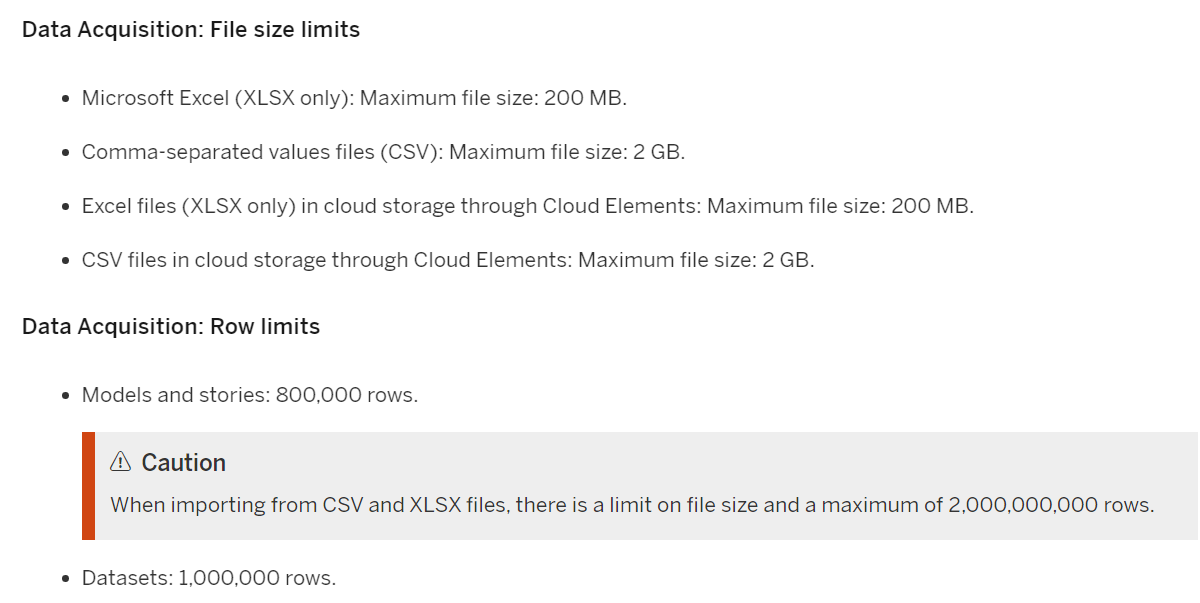 在System Sizing,Tuning and Limits里有数据导入相关的大小限制说明: