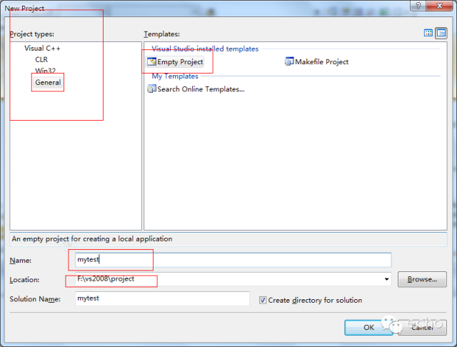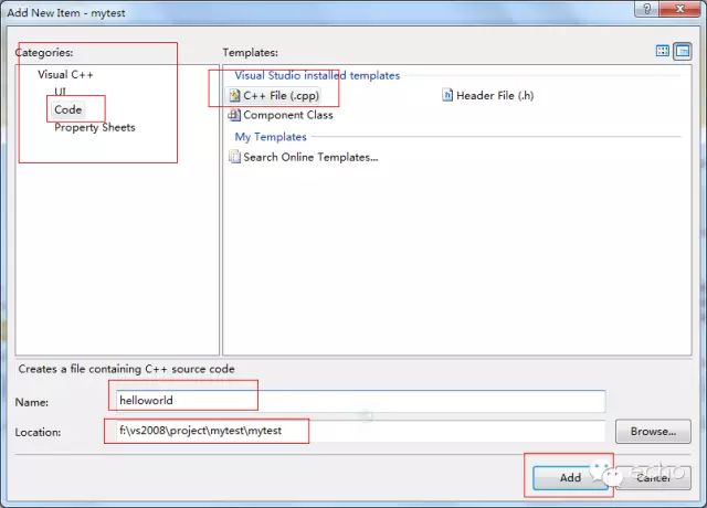 Name填写程序文件的名称,我这里写的是hellworld,此时就在F:\vs2008\project\mytest\mytest生成文件:helloworld.cpp(如果写的是hellworld.c 就生成helloworld.c)