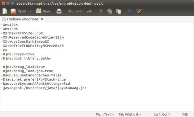 sudo gedit /opt/android-studio/bin/studio64.vmoptions