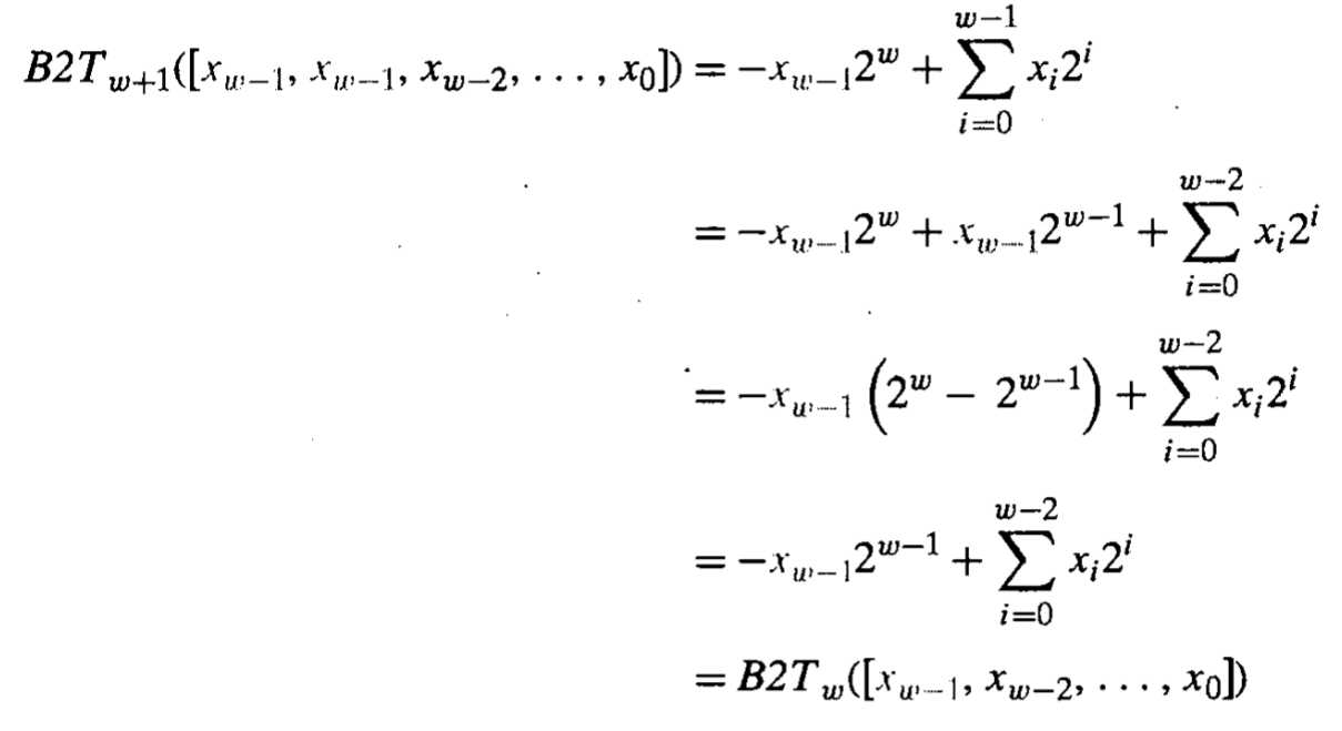 现在我们来考虑如何将较小的数字的位转换为一个更大的数据类型 (将较大的转化为较小的暂且不考虑), 对于无符号数而言, 只需要在扩展位上全部都补0就行了, 这种运算也称之为零扩展, 对于有符号数(补码数字)我们使用符号扩展, 也就是拓展位上全补上最高有效位的数字... 我们可以尝试着证明为什么这样做的结果是有效果的, 这里我们采用数学归纳法, 先证明对w位的补码数字, 扩展为w+1位时, 该补码数字值不变, 那么对于w+k, k为任意位时, 这个结论仍会成立...