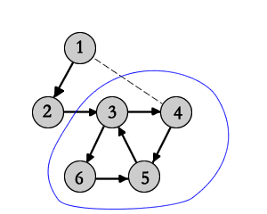 下图中,子图{1,2,3,4}为一个强连通分量,因为顶点1,2,3,4两两可达。{5},{6}也分别是两个强连通分量。