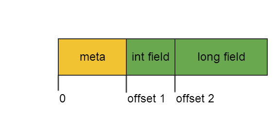 In this context, it is best to think of a class definition as a form of heterogeneous array. Note that the minimum field offset is not 0 but a positive value. The first few byte contain meta information. The graphic below visualizes this principle for an example object with an int and a long field where both fields have an offset. Note that we do not normally write meta information when writing a copy of an object into native memory so we could further reduce the amount of used native memoy. Also note that this memory layout might be highly dependent on an implementation of the Java virtual machine.