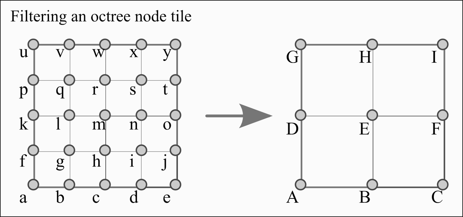 To filter the center voxel(texel E in the figure) in the node tile in upper mip level along the +X direction, we need to consider the 9 texels (texel g, h, i, l, m, n, q, r, s in the figure) in the lower level, The texels are divided into 4 groups as the figure below: