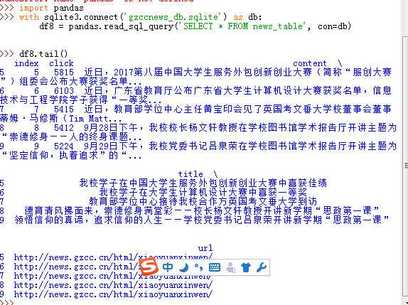 import requests import re import pandas from bs4 import BeautifulSoup import sqlite3 url = ‘http://news.gzcc.cn/html/xiaoyuanxinwen/‘ res = requests.get(url) res.encoding = ‘utf-8‘ soup = BeautifulSoup(res.text, ‘html.parser‘) def getclick(newurl): id = re.search(‘_(.*).html‘, newurl).group(1).split(‘/‘)[1] clickurl = ‘http://oa.gzcc.cn/api.php?op=count&id={}&modelid=80‘.format(id) click = int(requests.get(clickurl).text.split(".")[-1].lstrip("html(‘").rstrip("‘);")) return click def getdetail(listurl): res = requests.get(listurl) res.encoding = ‘utf-8‘ soup = BeautifulSoup(res.text, ‘html.parser‘) news={} news[‘url‘]=url news[‘title‘]=soup.select(‘.show-title‘)[0].text info = soup.select(‘.show-info‘)[0].text #news[‘dt‘]=datetime.strptime(info.lstrip(‘发布时间‘)[0:19],‘%Y-%m-%d %H:%M:‘) #news[‘source‘]=re.search(‘来源:(.*)点击‘,info).group(1).strip() news[‘content‘]=soup.select(‘.show-content‘)[0].text.strip() news[‘click‘]=getclick(listurl) return (news) def onepage(pageurl): res = requests.get(pageurl) res.encoding = ‘utf-8‘ soup = BeautifulSoup(res.text, ‘html.parser‘) newsls=[] for news in soup.select(‘li‘): if len(news.select(‘.news-list-title‘)) > 0: newsls.append(getdetail(news.select(‘a‘)[0][‘href‘])) return(newsls) newstotal=[] for i in range(2,3): listurl=‘http://news.gzcc.cn/html/xiaoyuanxinwen/‘ newstotal.extend(onepage(listurl)) df =pandas.DataFrame(newstotal) df.to_excel(‘gzccnews.xlsx‘) with sqlite3.connect(‘gzccnews_db.sqlite‘) as db: df.to_sql(‘news_table‘,con = db)