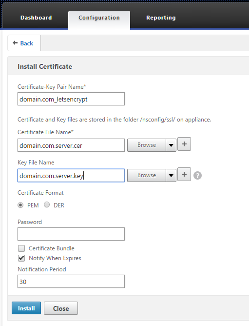 - Upon success, Let’s Encrypt will produce a set of files in /etc/letsencrypt/live/domain.com/. These PEMs need to be converted before they will work with the netscaler.