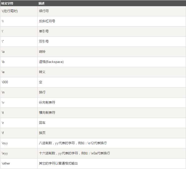 在需要在字符中使用特殊字符时,python用反斜杠(\)转义字符。如下表: