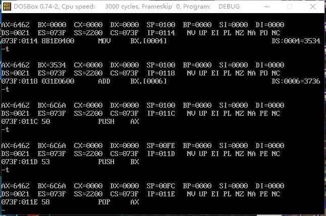 这一段程序段中,最开始用ax作为中转分别将ds和ss两个段地址赋值为0021和2200,在sp被赋值为0100后,栈顶就被设为2200:0100。之后四段指令修改了ax,bx的值。在这一段ax和bx的值是从0021:0,即我们修改的那一段开始取的,由于8086cpu是小端发。我们不难理解ax在mov ax,【0】执行后变为了ax=3130h,再加上3332h最后ax=6462h,同样的bx=3534h+3736h=6c6ah。之后push ax和push bx 依次将ax bx 压入栈中,压入栈中的过程中栈顶自然会发生变化这也就是为何在执行这一段时,sp每次缩减两个字节的原因。同样再pop将栈中数值弹出到ax和bx后,sp再次回到了原来的0100h。然而我们可以发现ax和bx交换了数值,这就是栈后进先出的实例,之前操作中我们后让bx进栈所以pop ax执行时将后入栈的6c6ah弹出到ax,先入栈的6462h弹出到bx。之后push 【4】和push【6】则是将我们通过e修改的值再次入栈,不再多说。