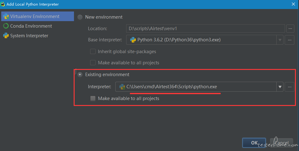 如果上述步骤无误的话,可以直接找到Existing environment选择即可,如果没有请使用添加并找到上述路径C:\Users\cmd\Airtest364\Scripts\添加.