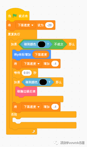我们仔细读程序,就会发现,在这个循环里的判断逻辑是这样,如果没有碰到黑线,就往下落。每一步下落的距离就是“下落速度”这个变量的值。如果碰到黑线,就往上后退,直到离开黑线。那大家有没有发现,这个逻辑其实就是个死循环。小球永远不可能停下来。