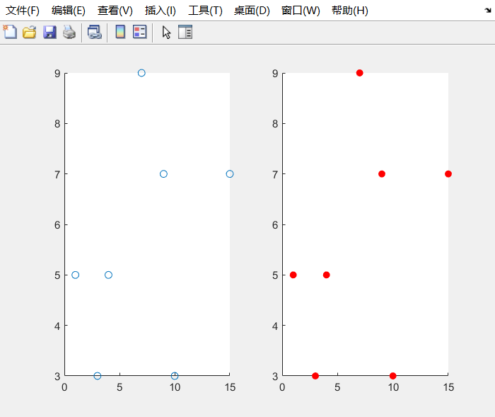 scatter(x,y,[],[1 0 0],'fill') % 散点的颜色和填充,[]表示圆的大小相同