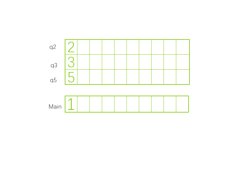 将1放入主队列,建3个队列q2,q3,q5分别表示×2,3,5得到的丑数。q2,q3,q5各自进1x2,1x3,1x5的值。