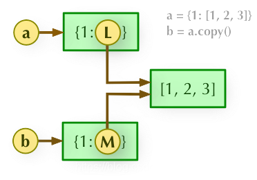 import copy a = {1:[1,2,3]} b = copy.deepcopy(a) print(id(a) == id(b)) print(id(a[1]) == id(b[1])) print(id(a[1][0]) == id(b[1][0]))