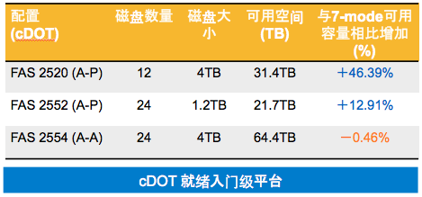 下图是针对FAS2500系列标准的内置12块和24块盘的配置中,和7-Mode相比可用容量的变化。除了FAS2554 的AA模式,其他的模式都大大提高了可用空间。